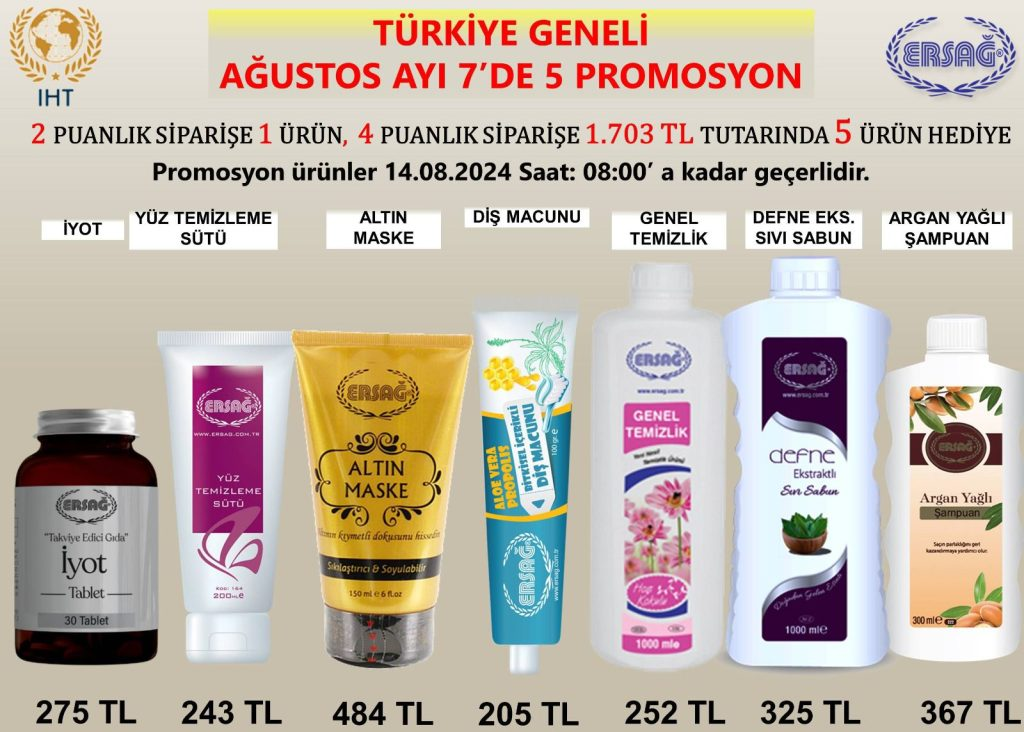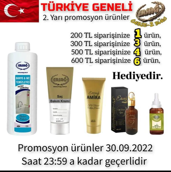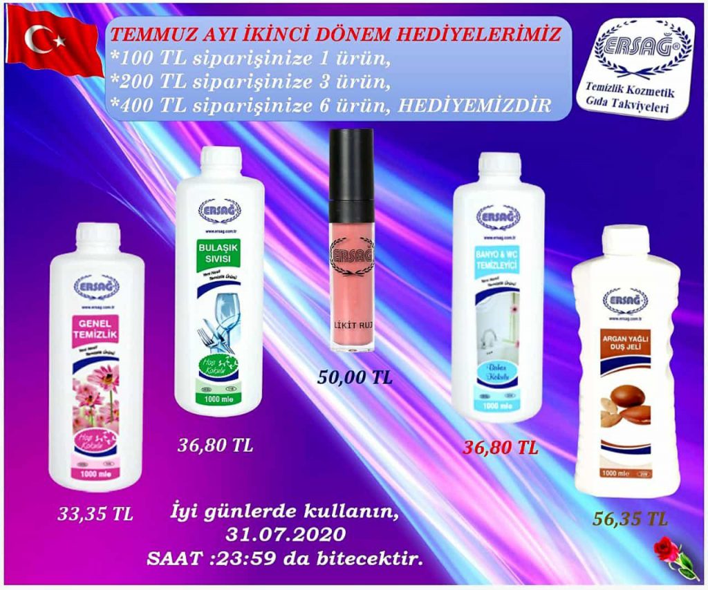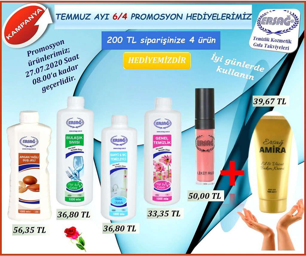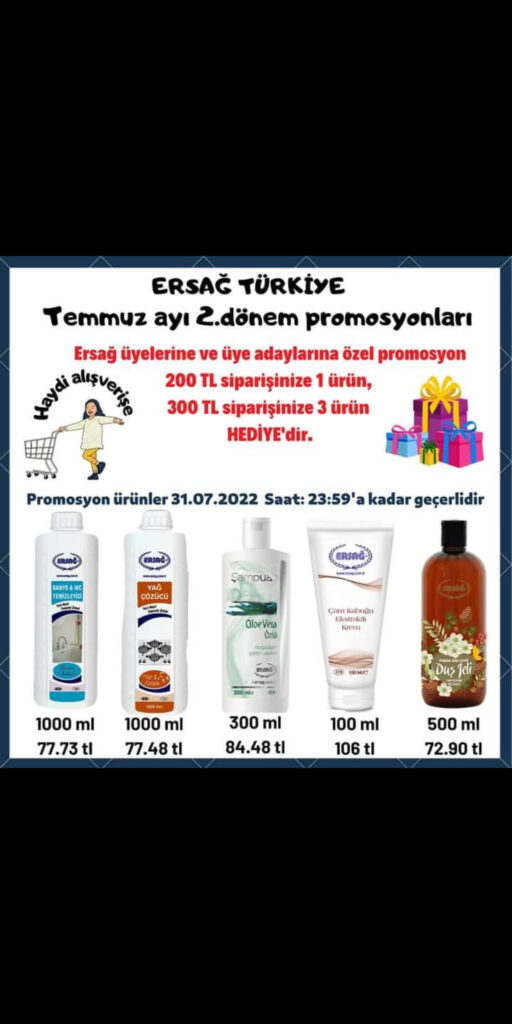 Ersağ Türkiye Temmuz Ayı Kampanyası Promosyonu. Ersağ 100 TL siparişinize 1 ürün, 200 TL siparişinize 4 ürün HEDİYE’dir. Promosyon ürünler 22.07.2019 Saat:23:59’a kadar geçerlidir. Hemen Ersağ Üye Ol kısmından formu doldurup Ersağ ailesine katılabilirsiniz. Ersağ a Üyelik yaparak çok daha avantajlı ürünler alıp sizde yararlanabilirsiniz. Ersağ da üyelik aidatı, 3 ay , 5 ay gibi süre ile sipariş verme zorunluluğu yoktur. Ersağ a Üye olan bir kimse kendi ihtiyacını gidermek için veya satış yapmak için de olabilir. Ailenizle birlikte sağlıklı bir yaşam için hemen Ersağ a üye ol un kazançlı çıkın.