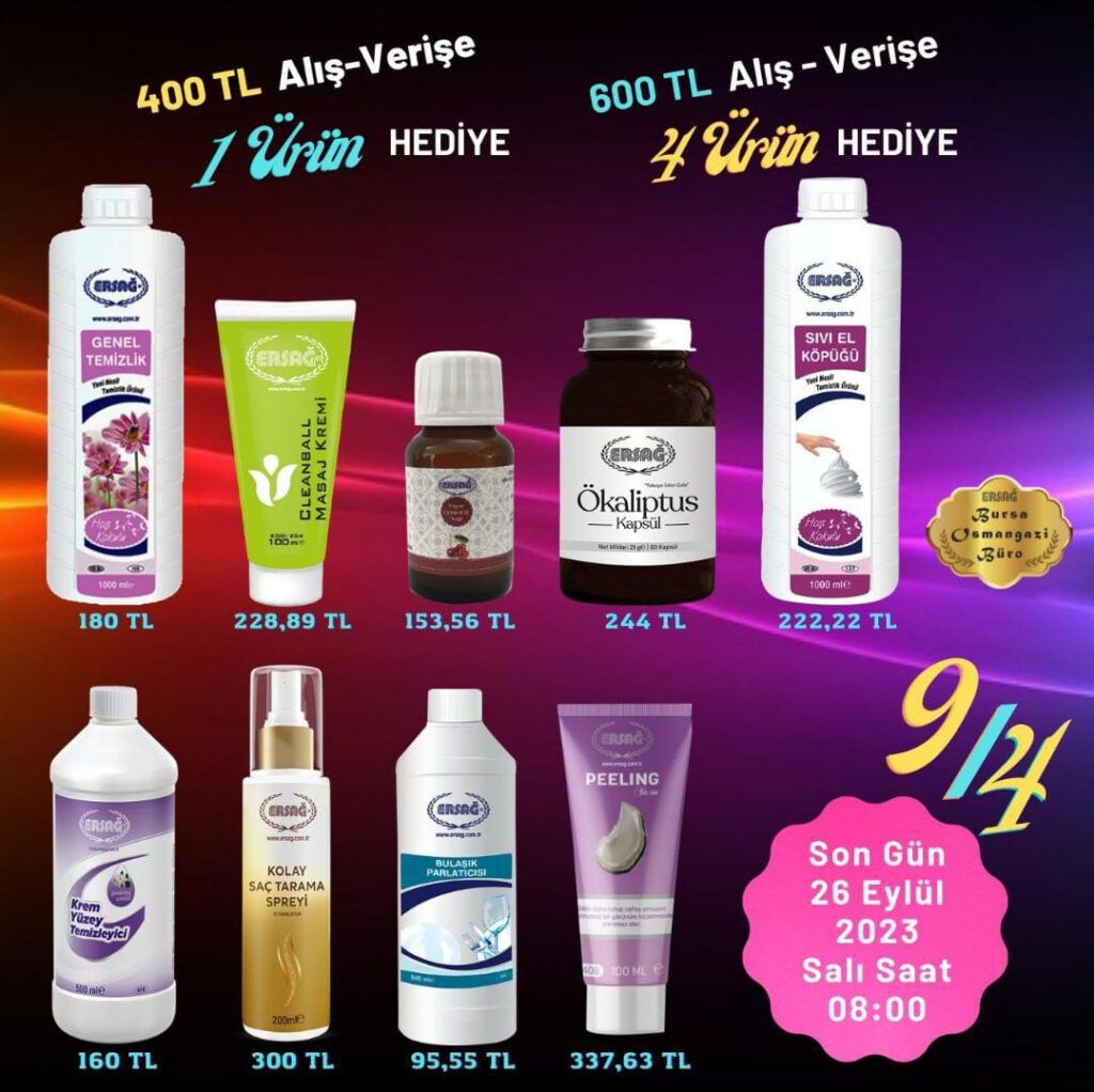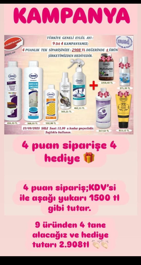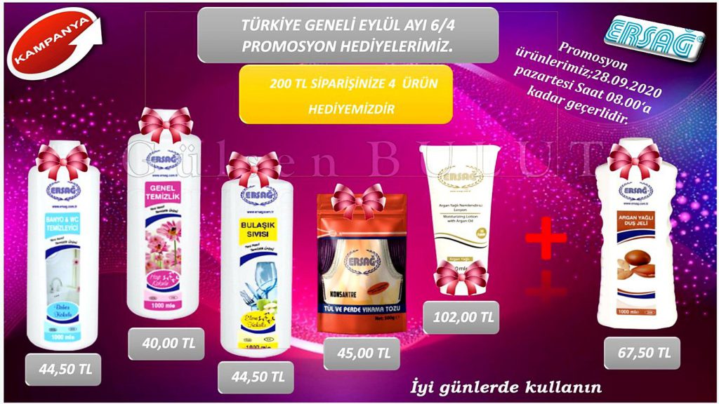 Ersağ Eylül ayı ikinci yarı kampanyası promosyonu Eylül 2019 açıklandı. 100 TL siparişinize 1 ürün, 200 TL siparişinize 4 ürün HEDİYE’dir. Promosyon ürünler 24.09.2019 Saat:08:00’e kadar geçerlidir. Hemen Ersağ Üye Ol kısmından formu doldurup Ersağ ailesine katılabilirsiniz. Ersağ a Üyelik yaparak çok daha avantajlı ürünler alıp sizde yararlanabilirsiniz. Ersağ da üyelik aidatı, 3 ay , 5 ay gibi süre ile sipariş verme zorunluluğu yoktur. Ersağ a Üye olan bir kimse kendi ihtiyacını gidermek için veya satış yapmak için de olabilir. Ailenizle birlikte sağlıklı bir yaşam için hemen Ersağ a üye ol un kazançlı çıkın.