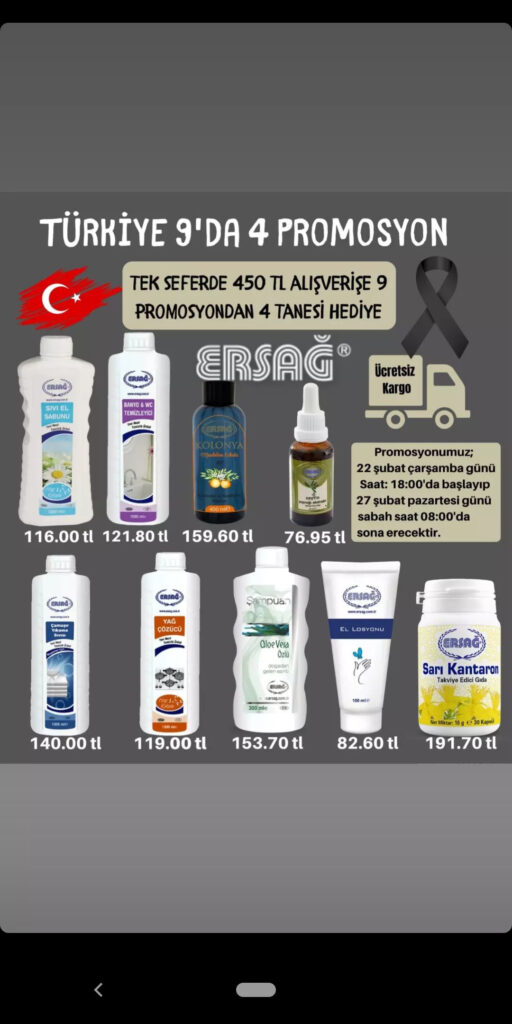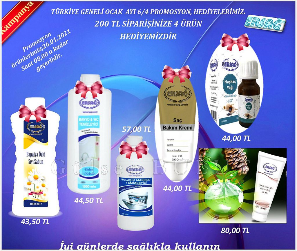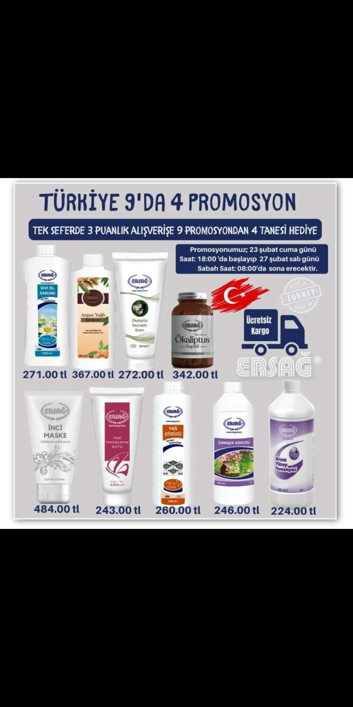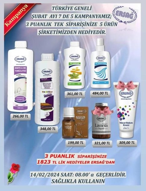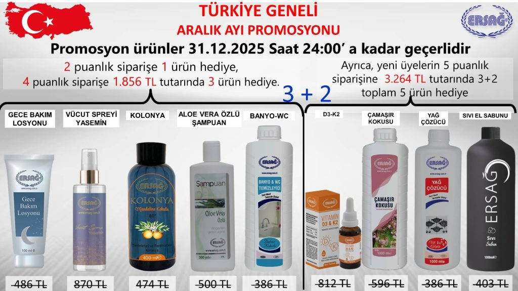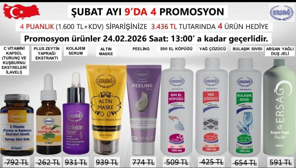 Ersağ Türkiye Şubat Ayı Kampanyası Promosyonu. Ersağ 100 TL siparişinize 1 ürün, 200 TL siparişinize 4 ürün HEDİYE’dir. Promosyon ürünler 25.02.2019 Saat:23:59’a kadar geçerlidir. Hemen Ersağ Üye Ol kısmından formu doldurup Ersağ ailesine katılabilirsiniz. Ersağ a Üyelik yaparak çok daha avantajlı ürünler alıp sizde yararlanabilirsiniz. Ersağ da üyelik aidatı, 3 ay , 5 ay gibi süre ile sipariş verme zorunluluğu yoktur. Ersağ a Üye olan bir kimse kendi ihtiyacını gidermek için veya satış yapmak için de olabilir. Ailenizle birlikte sağlıklı bir yaşam için hemen Ersağ a üye ol un kazançlı çıkın.