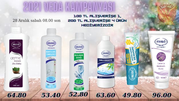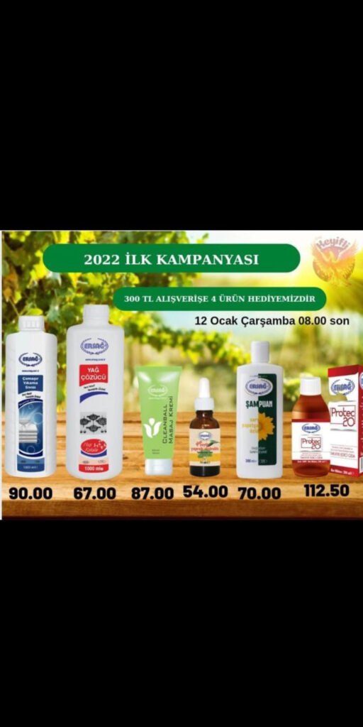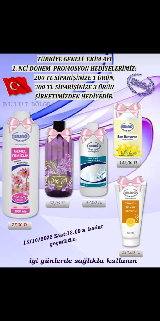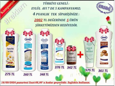 RENKLİ ÇAMAŞIR YIKAMA TOZU 1000 GR. ÇAMAŞIR AKTİF 1000 ML EL LOSYONU 200 ML VÜCUT LOSYONU 200 ML YAKA SPREYİ 250 ML. İyi Günlerde Kullanmanız Dileğiyle… NOT: Kampanyadan yararlanabilmek için; 21 Temmuz Cumartesi günü saat 18:00 ile 23 Temmuz Pazartesi günü saat 23:59 ‘a kadar siparişlerin girilip, Ödemelerin ise en geç 31 Temmuz Salı gününe kadar hesabımıza geçmiş olması gerekmektedir.