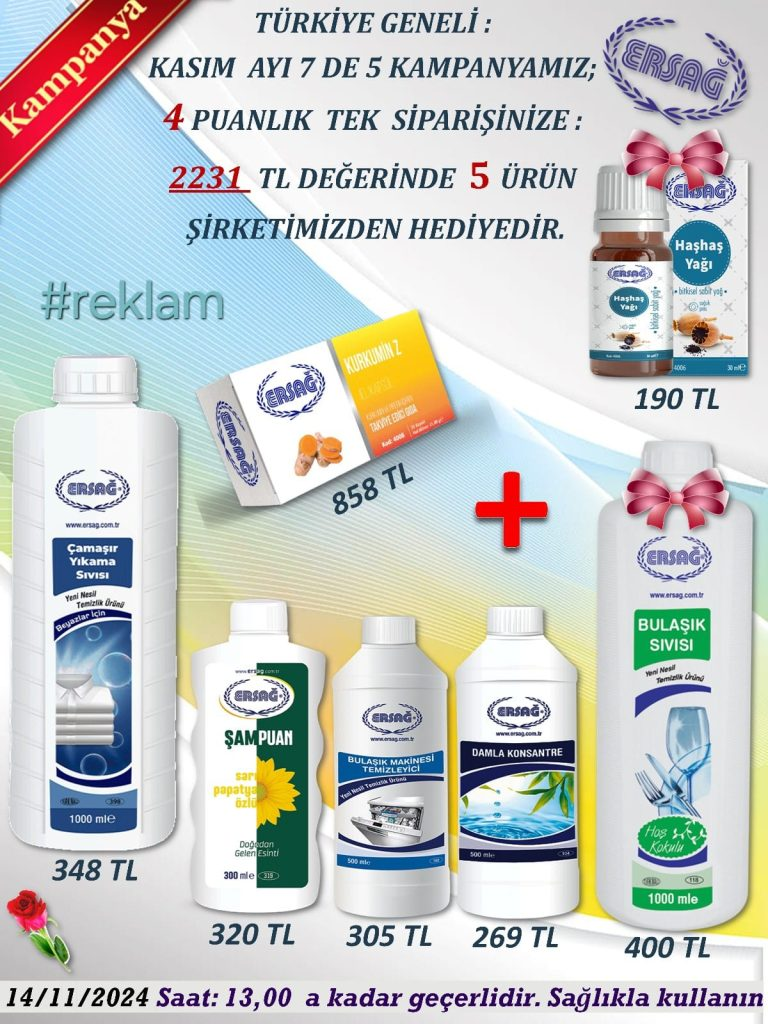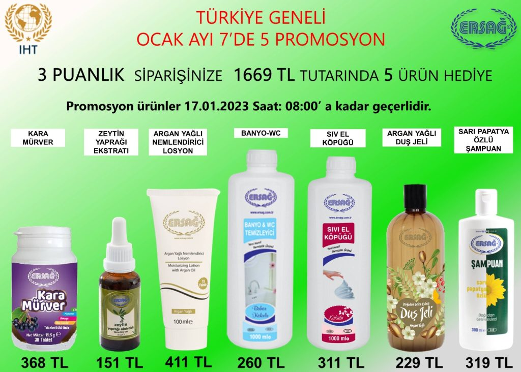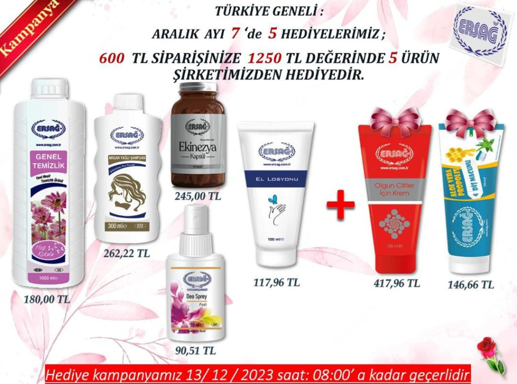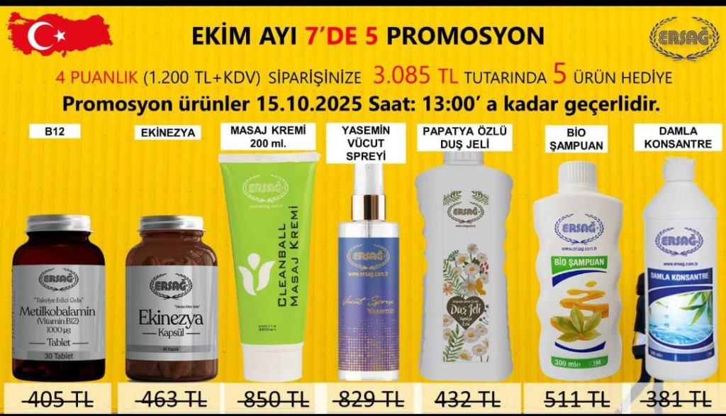 Ersağ Ekim ayı 7 de 5 kampanyası promosyonu 2019 açıklandı. 100 TL siparişinize 1 ürün, 200 TL siparişinize 5 ürün HEDİYE’dir. Promosyon ürünler 09.10.2019 Çarşamba Saat:08:00’e kadar geçerlidir. Hemen Ersağ Üye Ol kısmından formu doldurup Ersağ ailesine katılabilirsiniz. Ersağ a Üyelik yaparak çok daha avantajlı ürünler alıp sizde yararlanabilirsiniz. Ersağ da üyelik aidatı, 3 ay , 5 ay gibi süre ile sipariş verme zorunluluğu yoktur. Ersağ a Üye olan bir kimse kendi ihtiyacını gidermek için veya satış yapmak için de olabilir. Ailenizle birlikte sağlıklı bir yaşam için hemen Ersağ a üye ol un kazançlı çıkın.